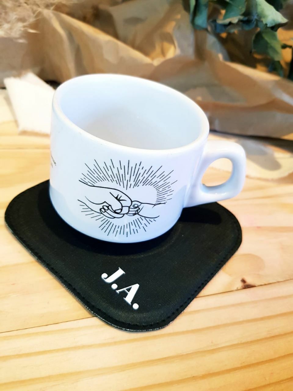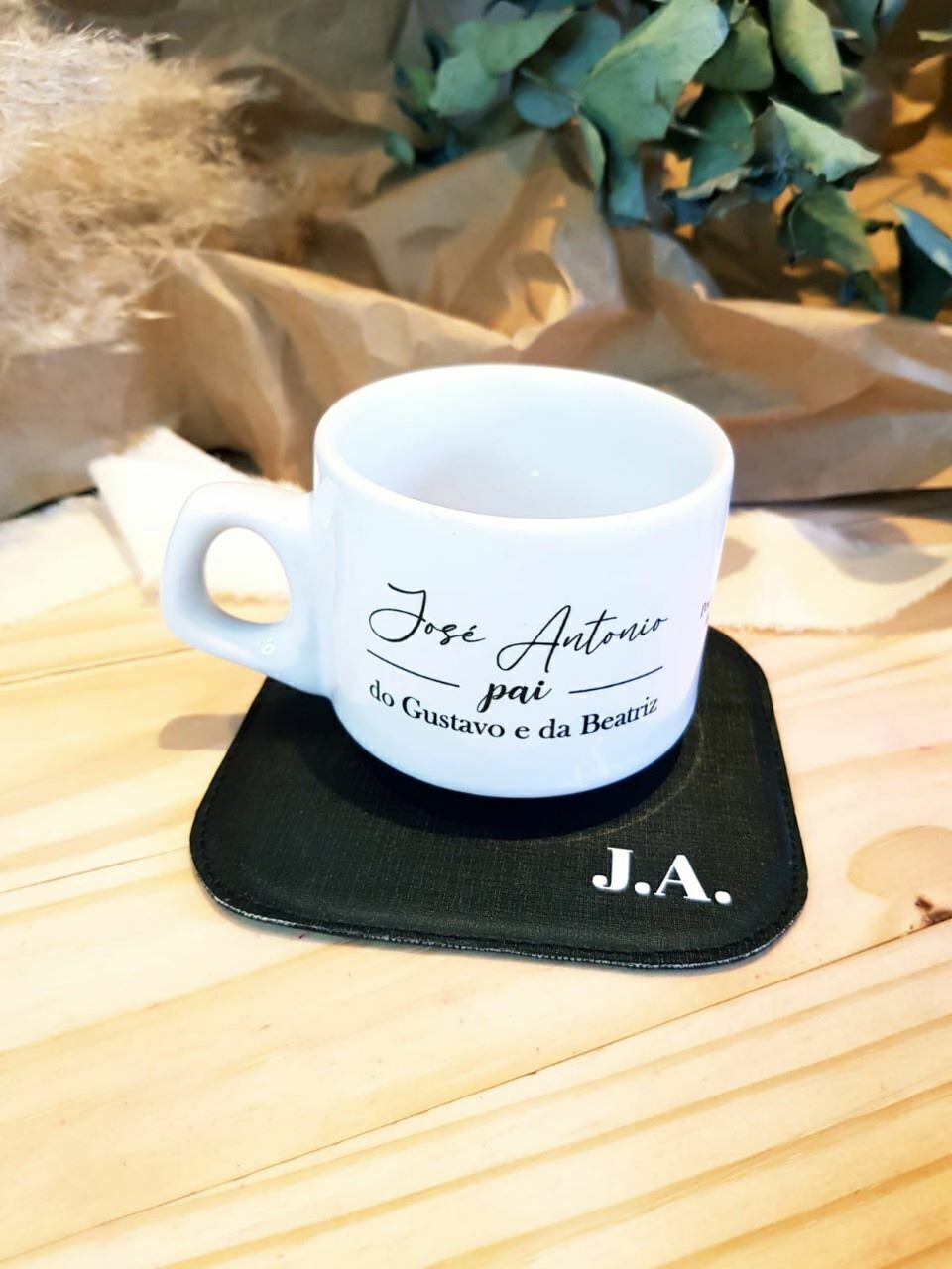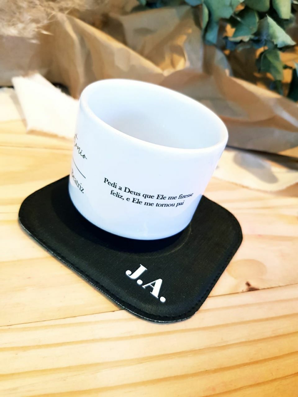Xícara em cerâmica branca, 220ml, estampa a escolher.Acompanha base em couro sintético personalizado com iniciais.